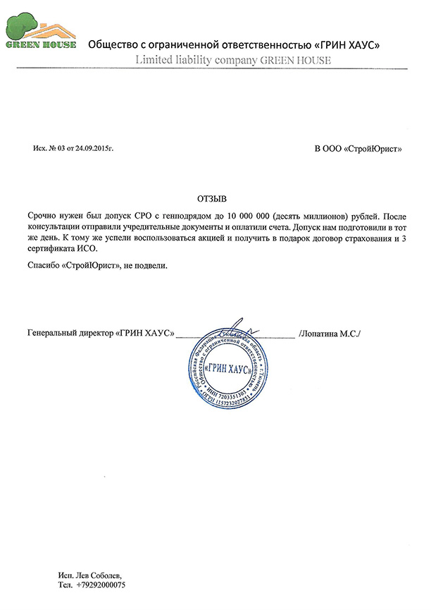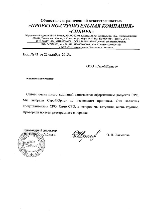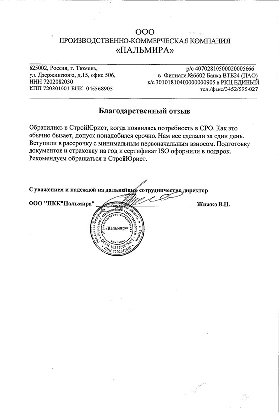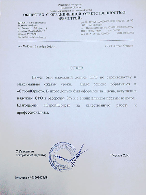 Отзывы клиентов "СтройЮрист" по вступлению в СРО в Златоусте