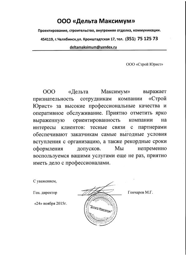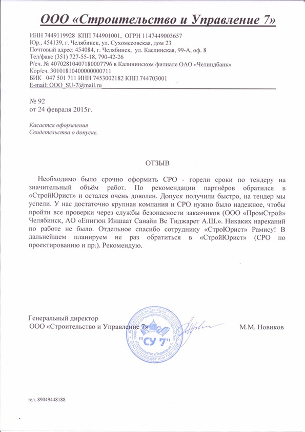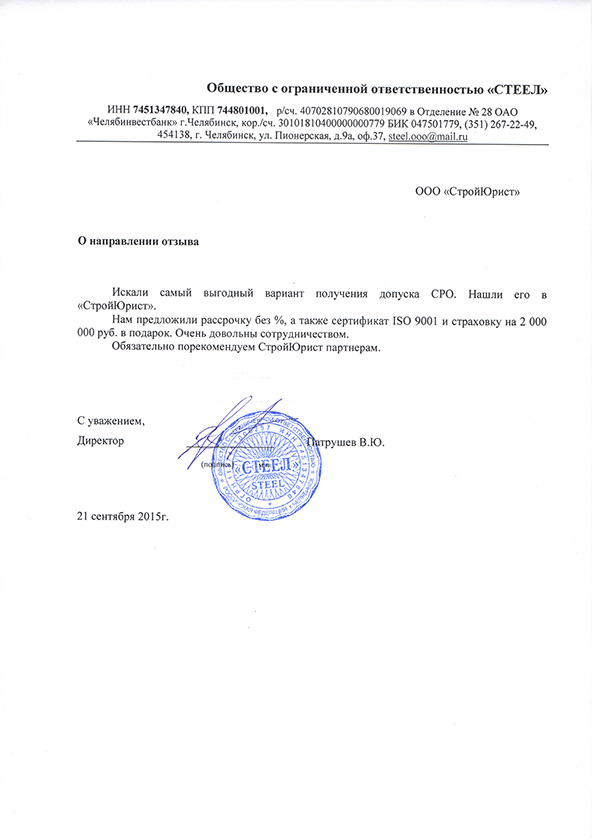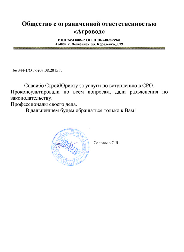 Отзывы клиентов "СтройЮрист" по вступлению в СРО в Златоусте